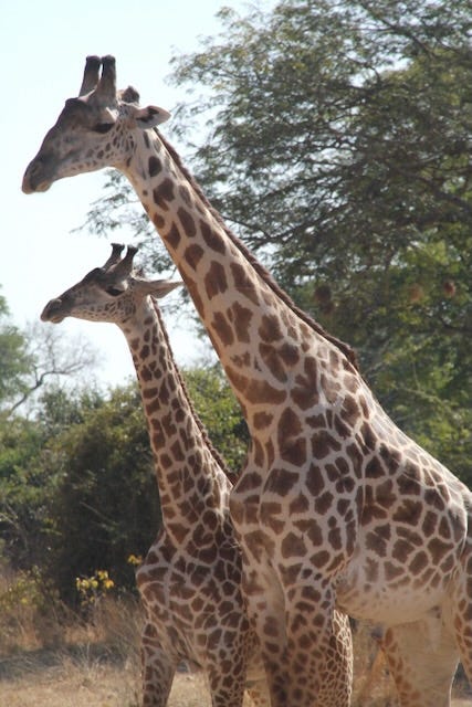 Our first walking safari commenced. Manda instructed us to tread in a single line so as not to frighten/challenge any wildlife we might happen upon. Leading the way was a gun-toting guide name Priest, followed by Manda. Bringing up the rear was a third guide, whom I will call Angel, as he helped my airplane-swollen, chronically injured knees traverse cliffs and uneven mud fields cratered by elephants. Tracks in the dirt were pondered. Various types of dung inspected. The calls of birds deciphered. All these clues from nature determined a course to the Luangwa River. Waiting just across the shore were a pair of giraffes.