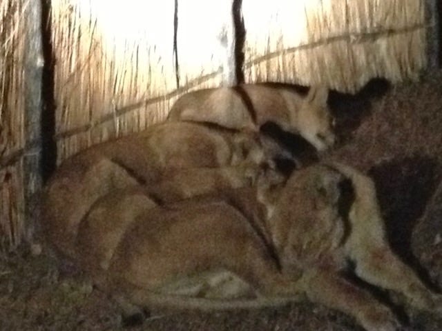 Finally, we piled back into the Land Rover and headed home. Indeed, the lions remained in camp, though they’d found a cozier spot to sleep, just outside of Tom’s chalet. Were they waiting for the return of that polar fleece?
